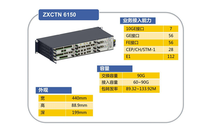 ZXCTN 6150產(chǎn)品應(yīng)需而生,致力于為行業(yè)用戶(hù)以及運(yùn)營(yíng)商打造一張高效、節(jié)能的承載精品網(wǎng),全面提高網(wǎng)絡(luò)核心競(jìng)爭(zhēng)力,助力行業(yè)用戶(hù)以及運(yùn)營(yíng)商拓展市場(chǎng)和進(jìn)行業(yè)務(wù)創(chuàng)新。ZXCTN 6150提供了10GE/GE/FE/STM-1/E1等豐富的業(yè)務(wù)接口,全面涵蓋了2G、3G、LTE、大客戶(hù)業(yè)務(wù)的傳送需求,兼顧現(xiàn)網(wǎng)和未來(lái)的業(yè)務(wù)需求;具備超強(qiáng)的多場(chǎng)景適用性,降低維護(hù)的復(fù)雜度,提升運(yùn)維效率。